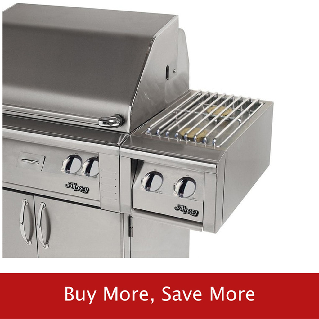 An Alfresco side burner is the perfect complement sitting next to your grill for boiling, heating, and simmering anything you need to put into a pot. Built from all commercial stainless steel with heli-arc welded seams, the side burner features two high-performance burners with electronic ignition. The recessed top and stainless steel cover offers protection from wind and elements.