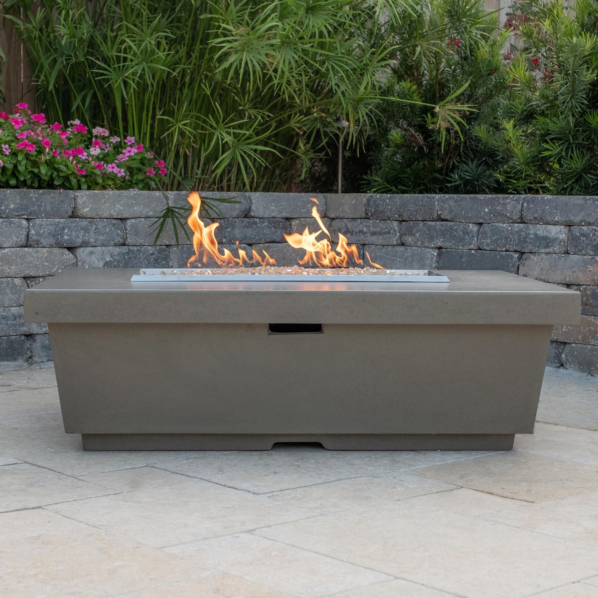 The Contempo Rectangular Firetable by American Fyre Designs is an elegant addition to any outdoor space. The 304 commercial grade stainless steel burner produces 60,000 BTUs of heat in glimmering flames and is controlled with a simple key valve. Handcrafted from glass fiber reinforced concrete for strength and durability. Glass Fiber Reinforced Concrete (GFRC) is specially formulated using Portland cement, glass fibers, aggregates, and polymers to give a higher strength with a fraction of the weight of pre-cast concrete, and has superior durability in outdoor applications. GFRC cannot rust like steel and is weather resistant, fire retardant, and impermeable to give years of enjoyment with cast-in color and low maintenance. The Fire Table has a Smoke finish that will blend with any decor. Create a one-of-a-kind look with a wide variety of fire glass, lava rocks, and other fire pit decor. The fire glass shown is not included with this product. The recommended amount of fire glass for this firetable is 40 pounds. For lava rock, 20 pounds is required to properly cover the burner.