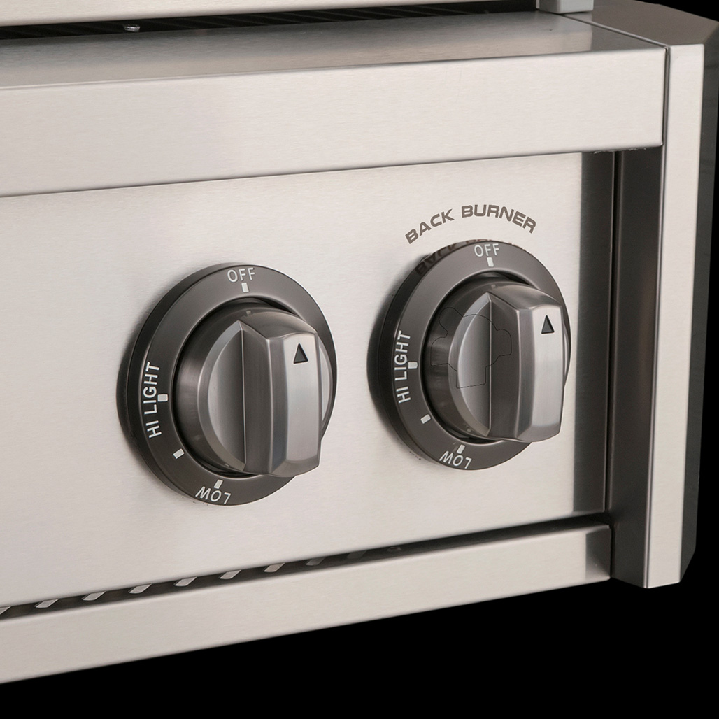 Accessible Control Knobs with Die Cast Alloy Bezels in Gun Metal Finish. Turn the knobs for a piezo ignition that lights every time and eliminating the need for electricity or batteries.