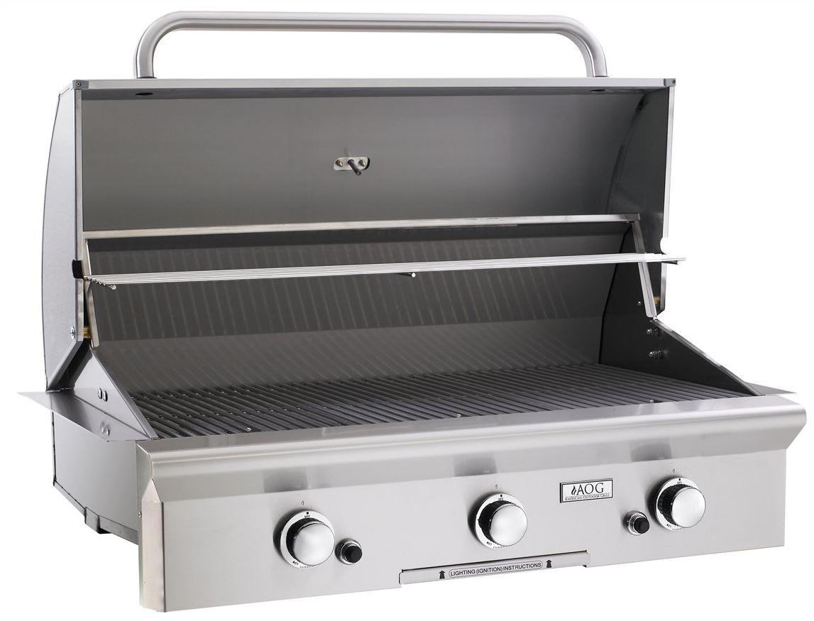 The American Outdoor Grill built-in collection is designed for long-lasting, unsurpassed performance that produces unbelievable flavor. All AOG built-in grills boast a stylish, sleek appearance, including the beautiful double-layered satin finish hood, stainless steel construction, and custom-designed analog thermometer with polished bezel. Proudly made in the USA and built to last, this AOG T-Series natural gas grill features commercial grade 304 series stainless steel construction, long-lasting stainless cooking grids and heavy-duty warming rack, and highly-sophisticated stainless steel 50,000 BTU U-shaped burners with integrated support posts for performance and durability. If you enjoy grilling veggies, steaks, and chicken all year long on an incredible grill, the first thing you will appreciate is the brand-new Piezo Rapid Light ignition, firing you up that much quicker with no electricity or batteries. Other great features on this grill include 648 sq inches of primary grilling space, stainless steel vaporizer panels (also called flame tamers) for even heat distribution, solid brass valves with red-flared front knobs for precise temperature control and longer life, and a funneled grease management system with slide-out drip tray for painless clean up. Whether you enjoy entertaining the neighbors or rounding up the family for a fresh meal, this AOG 36-inch T-Series gas grill will add style and cooking excellence to compliment your outdoor lifestyle.