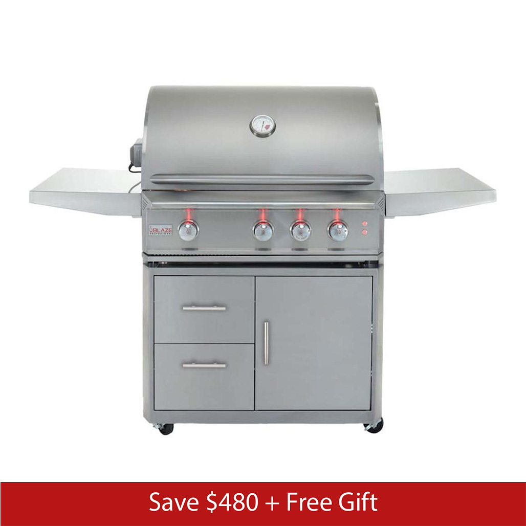 This Blaze stainless steel grill cart is specifically designed to house the Blaze Professional 3 burner gas grill. The two stainless steel side shelves keep your BBQ tools at hand and provide a convenient work area while you cook. The Blaze grill cart also features one soft close hinged front door with a modern handle to access the cabinet below the grill where you can store your propane tank. It also features two lighted drawers to store your grill cover and BBQ accessories. The cart is warranted for lifetime to the original owner against defects in manufacturing and workmanship. This warranty extends to the original purchaser against manufacturer defects for products purchased for ordinary single-family home use.