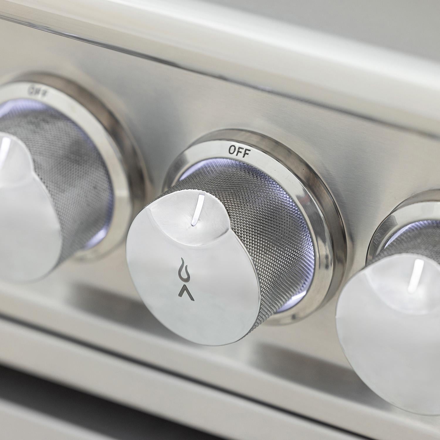 Non-slip, knurled control knobs feature LED lights with temperature indicators for safety