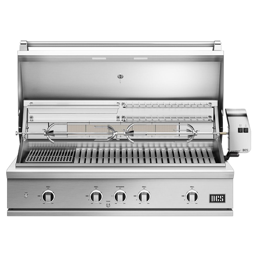 An infrared rotisserie burner provides controlled searing heat up to 18,000BTU. The heavy-duty motor easily turns a 50lb load, ideal when cooking for a big crowd.The rotisserie rod is conveniently stored under the drip pan handle.