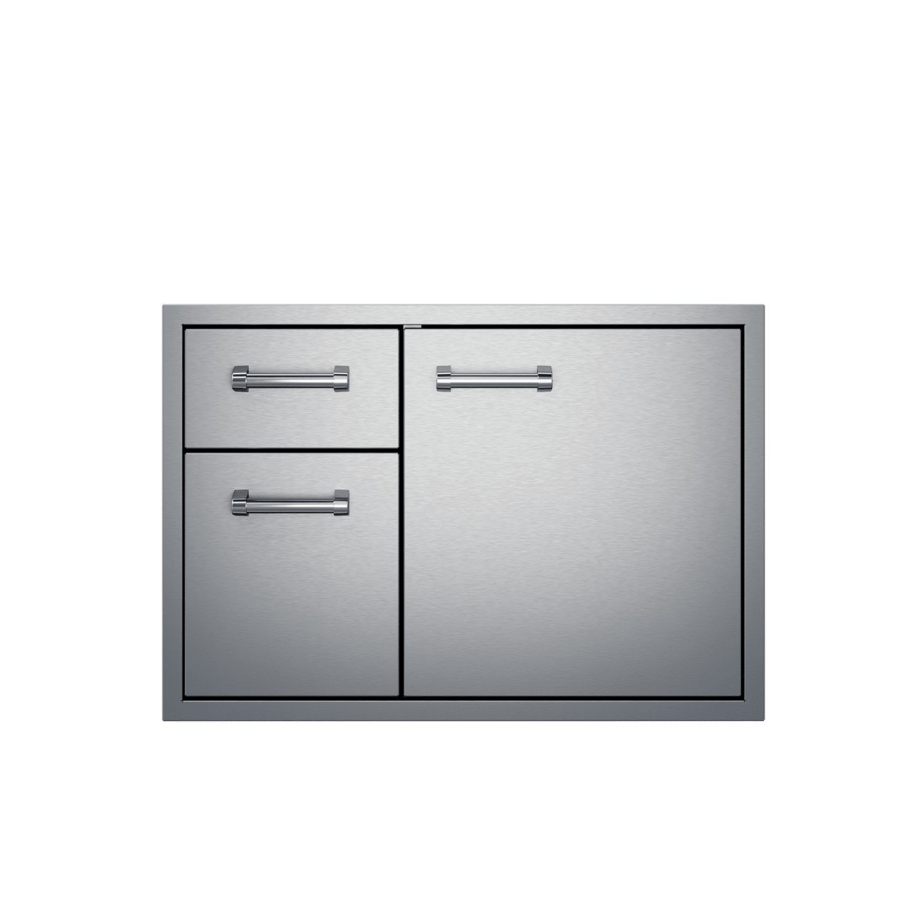 Complete your Delta Heat outdoor kitchen with these storage door and drawer combo units that offer the sleek, high-polished premium quality the Delta Heat brand is known for. This 30-Inch door and drawer combo unit is constructed of 304 stainless steel with a one-piece 18 gauge frame. The right side access door has adjustable European hinges and provides convenient access to the inside of your BBQ island for gas and water plumbing or storage needs. The left side features two (2) extra deep drawers for oversized utensils and heavy-duty full extension drawer glides. This door and drawer combo unit is the perfect compliment to your Delta Heat built-in grill. Delta Heat products are designed and manufactured in the USA with pride.