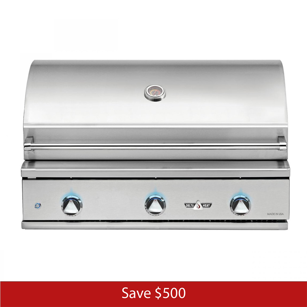 This Delta Heat gas grill brings exceptional quality and performance to any outdoor kitchen. Delta Heat gas grills feature 304 stainless steel with seamless welded construction, sleek high-polished accents, and double-lined hood for maximum strength, durability, and appeal to your entertaining experience. This 38-inch grill has three (3) 18 gauge stainless steel U-Burners, ceramic briquette flame tamers that distributes the radiant heat more evenly across the cooking surface, and stainless steel cooking grates. Decorative blue LED lights illuminate the control knobs turning your grill into the main attraction and the interior halogen lights illuminate the 625 square inches of main cooking surface for entertaining at night. The grill has 210 square inches of secondary cooking with the adjustable warming rack. Delta Heat products are designed and manufactured in the USA with pride.