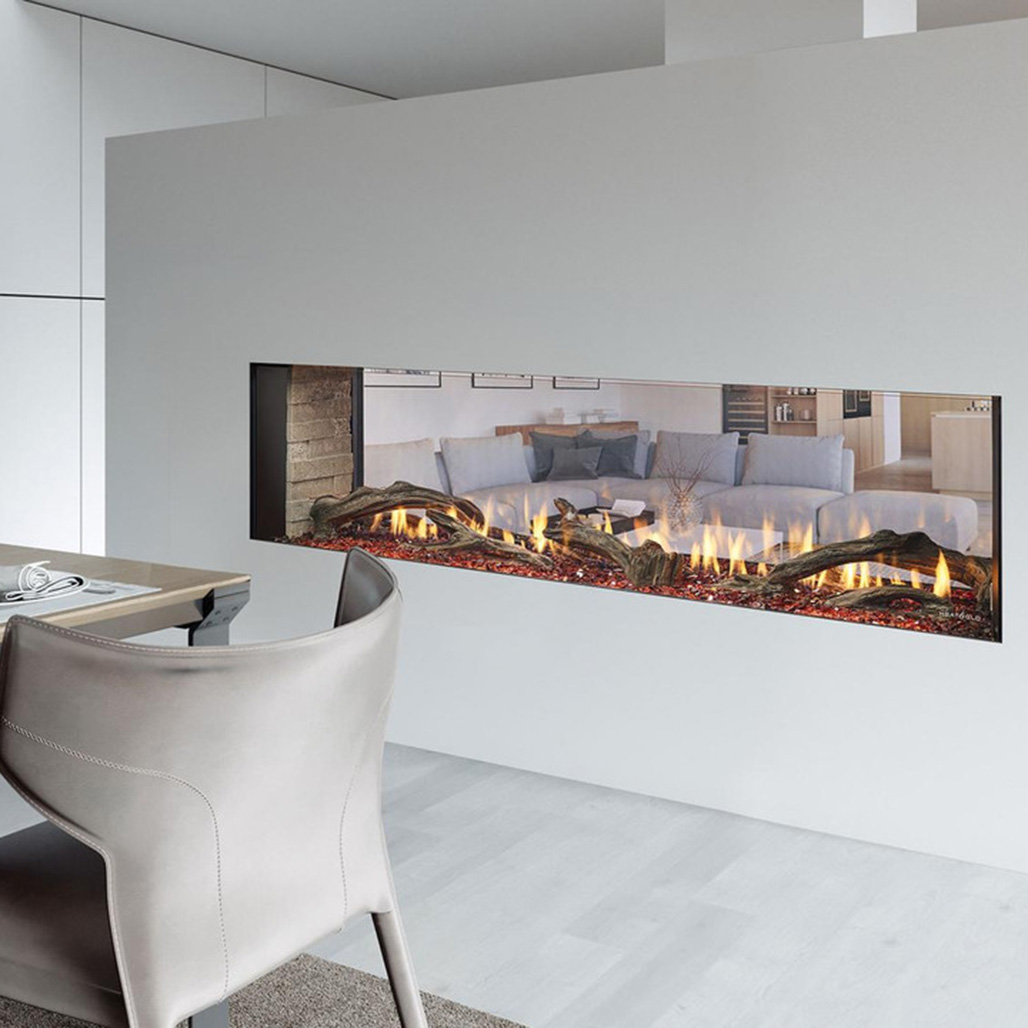 Elevate two spaces at once. Whether an interior room divider or a beautiful bridge for indoor-outdoor living, the Primo II gas linear fireplace is a stunning addition. Built-in heat management makes it safe to install your TV above this fireplace, with mere inches in between.
