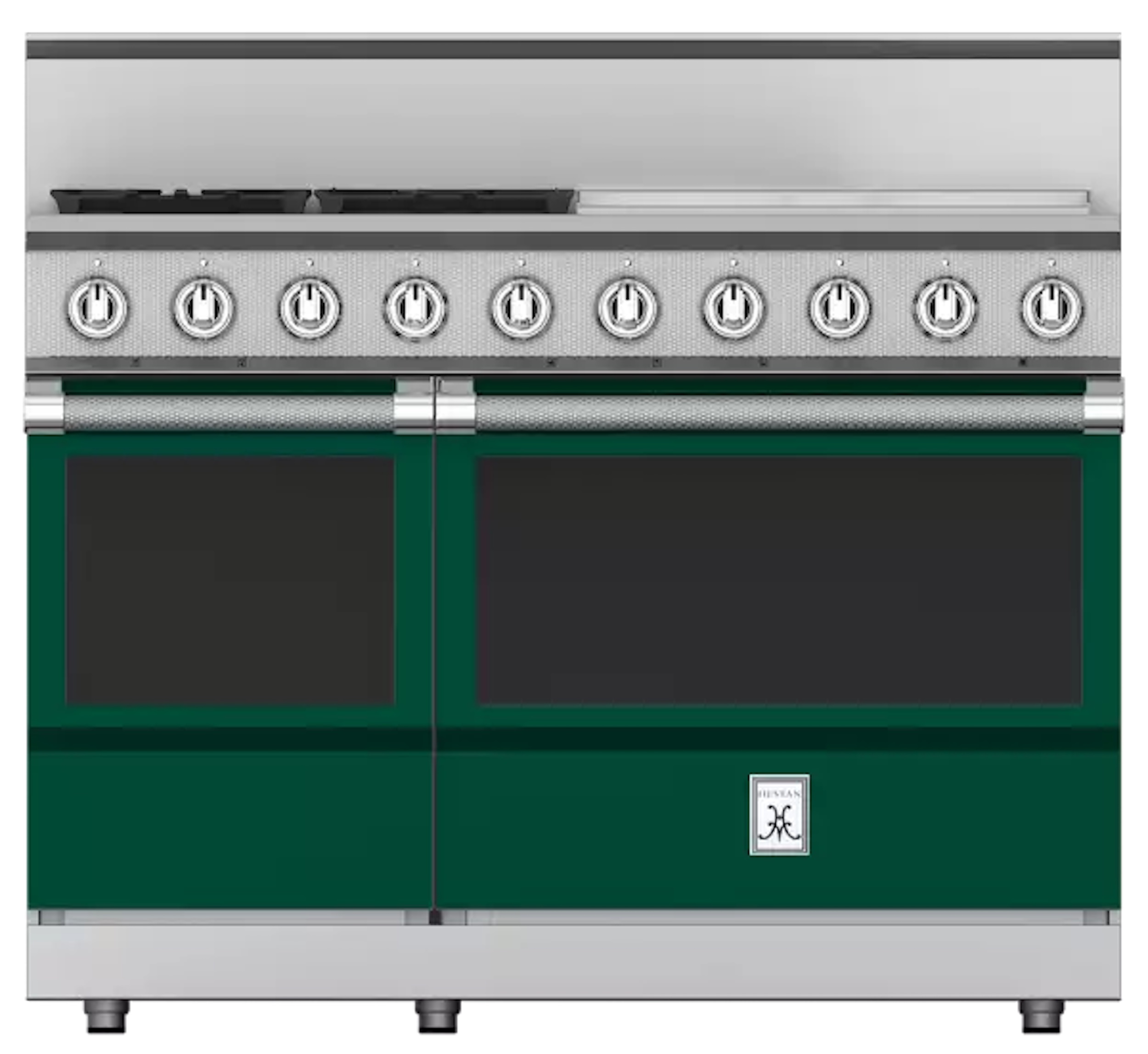 High-performance dual-flow burner system allows for significant turndown capability from high BTU performance (23,000 BTUs front burners) to low continuous simmer (500 BTUs all burners).