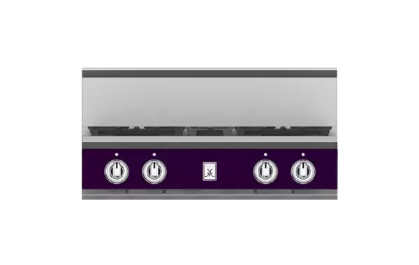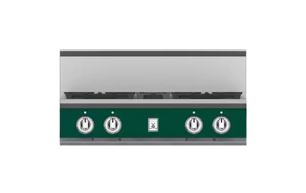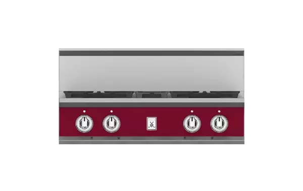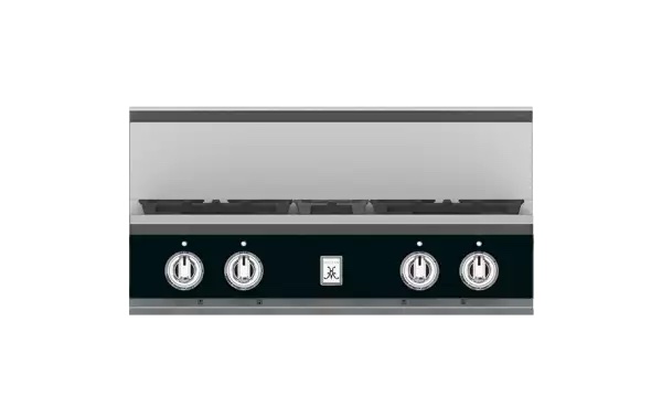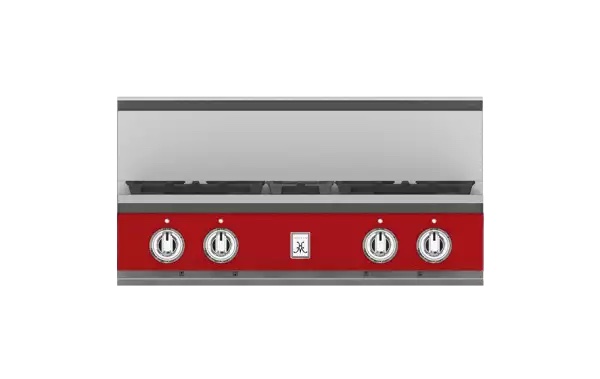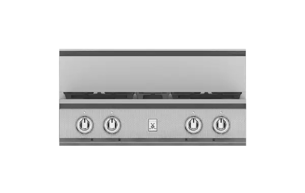 High-performance dual-flow burner system allows for significant turndown capability from high BTU performance (23,000 BTUs Front Burners) to low continuous simmer (500 BTUs All Burners).