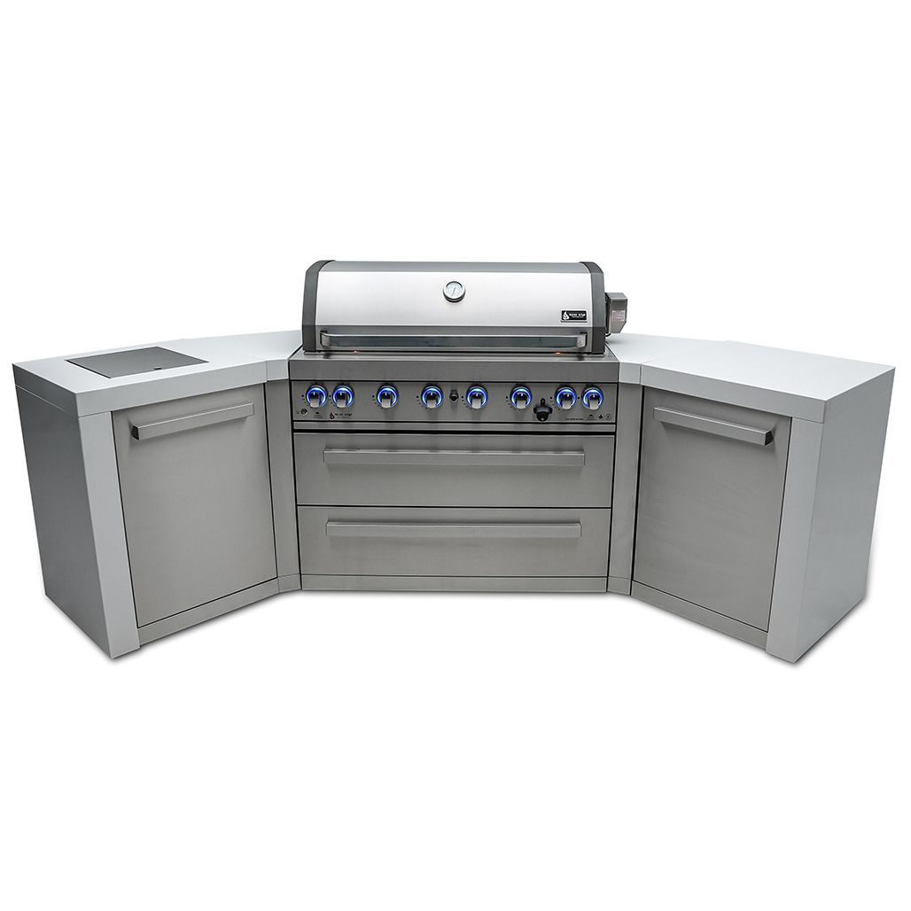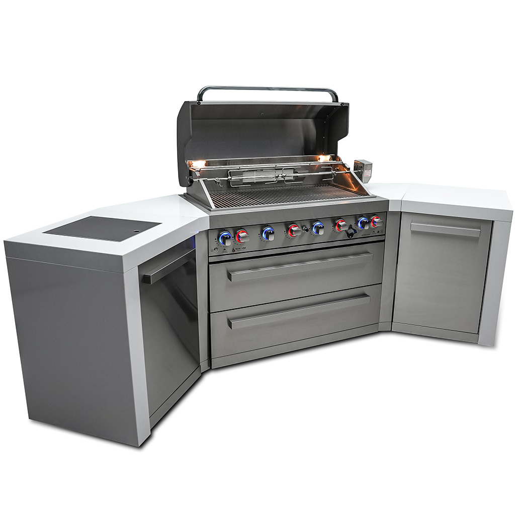 Elevate your outdoor cooking with the Mont Alpi 6-burner Deluxe Island with 45-degree corners. The MAi805-D45 boasts six burners, an infrared side burner, and an infrared rear burner for a rotisserie experience. The 45-degree corner modules add extra prep area, making it perfect for tighter patios with corners. The grill is made of 304 Stainless Steel components and includes a rotisserie kit, full-size weather cover, and a granite matching chopping board. With LED knob lights, bright internal cooking lights, and white granite surfaces, this grill provides perfect vision and precision control.