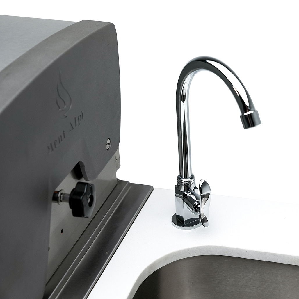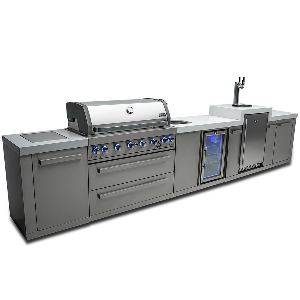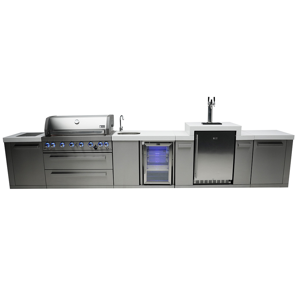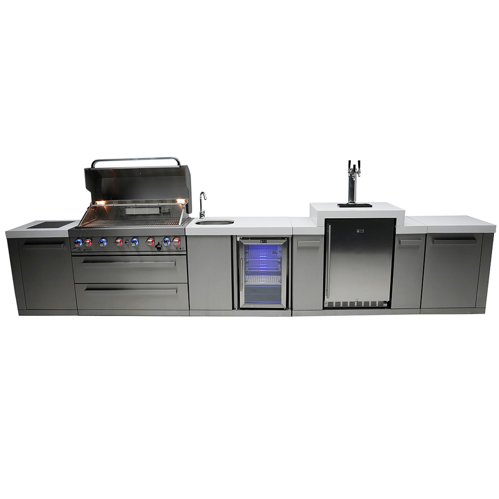 The beverage center and kegerator module are equipped with an outdoor-rated refrigerator, sink, and faucet, making it the ultimate refreshment and food preparation station. The kegerator offers the perfect pour for up to 3 barrels, keeping your guests cool and refreshed. The sleek counter granite surfaces make cleaning a breeze, and with optional accessories like the heavy-duty rotisserie kit, charcoal tray, and griddle, the customization options are endless.