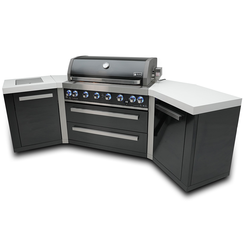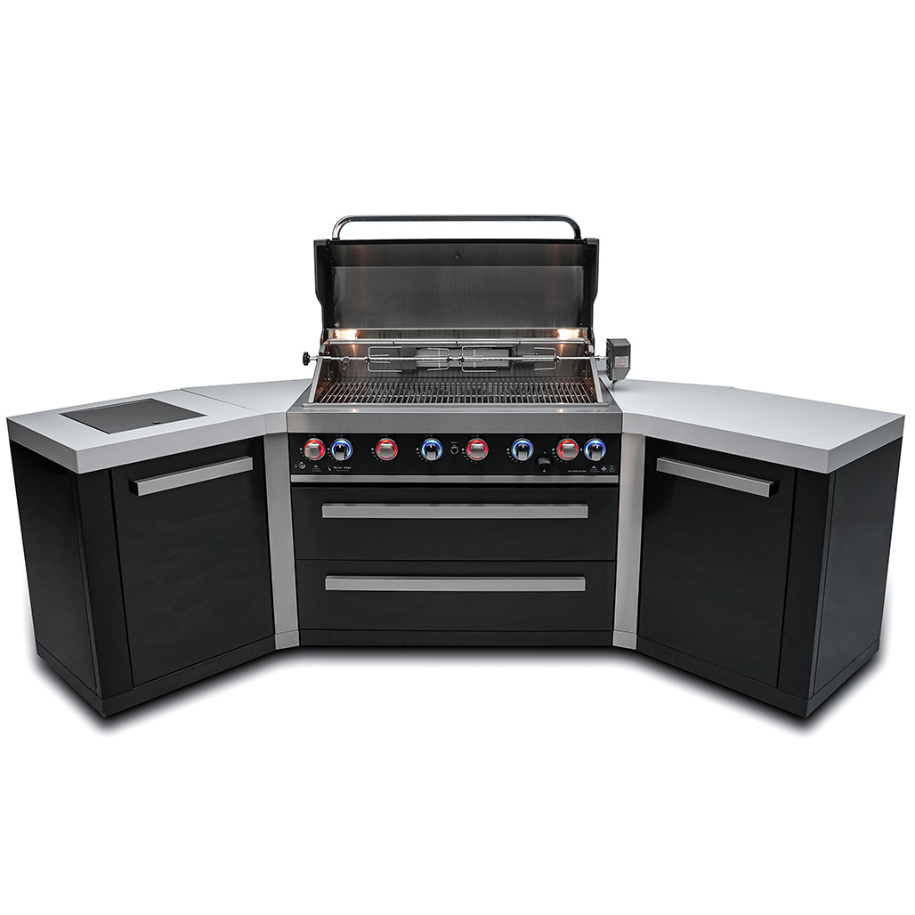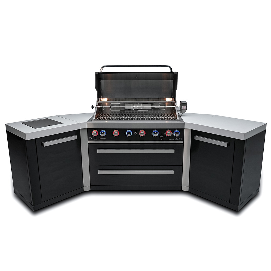 Upgrade your outdoor cooking game with the sleek and stylish Mont Alpi 805 Black Stainless Steel Island with 45-degree corners. This grill features six standard burners, an infrared side burner, and an infrared rear burner with a heavy-duty rotisserie kit for the ultimate rotisserie experience. The LED knob lights and bright internal cooking lights provide precision control over your grilling, while the countertop granite adds an extra touch of class and easy cleaning.