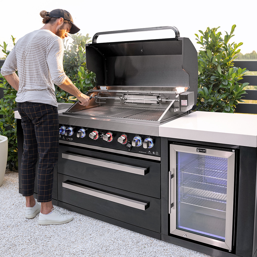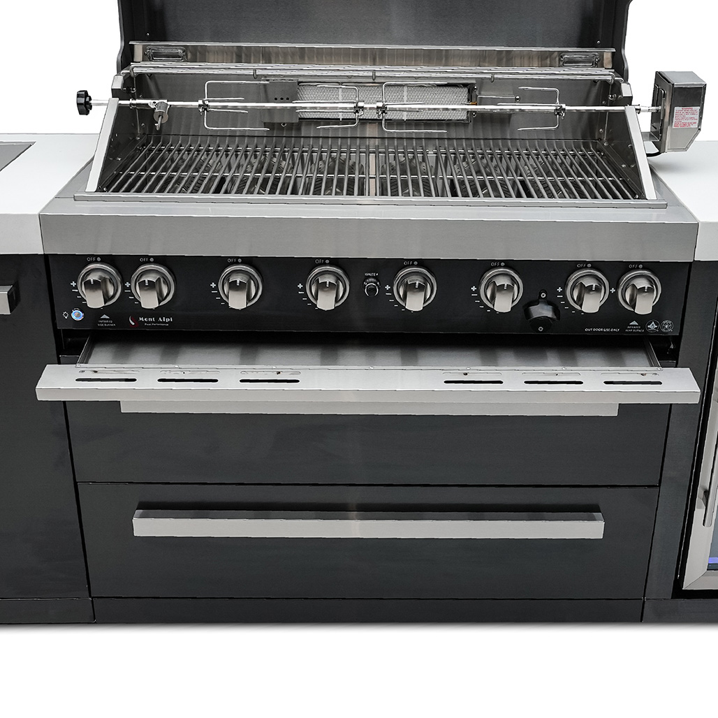 Elevate your outdoor cooking experience with the Mont Alpi 805 Black Stainless Steel Island with a Fridge Cabinet. This grill combines durability and style with six standard burners, an infrared side burner, and an infrared rear burner for the ultimate cooking experience. The outdoor-rated refrigerator is perfect for keeping your drinks and ingredients cold and at hand, while the LED lights and temperature control ensure precision control while grilling.