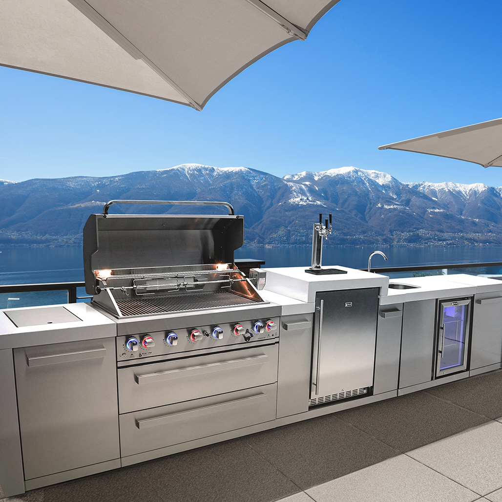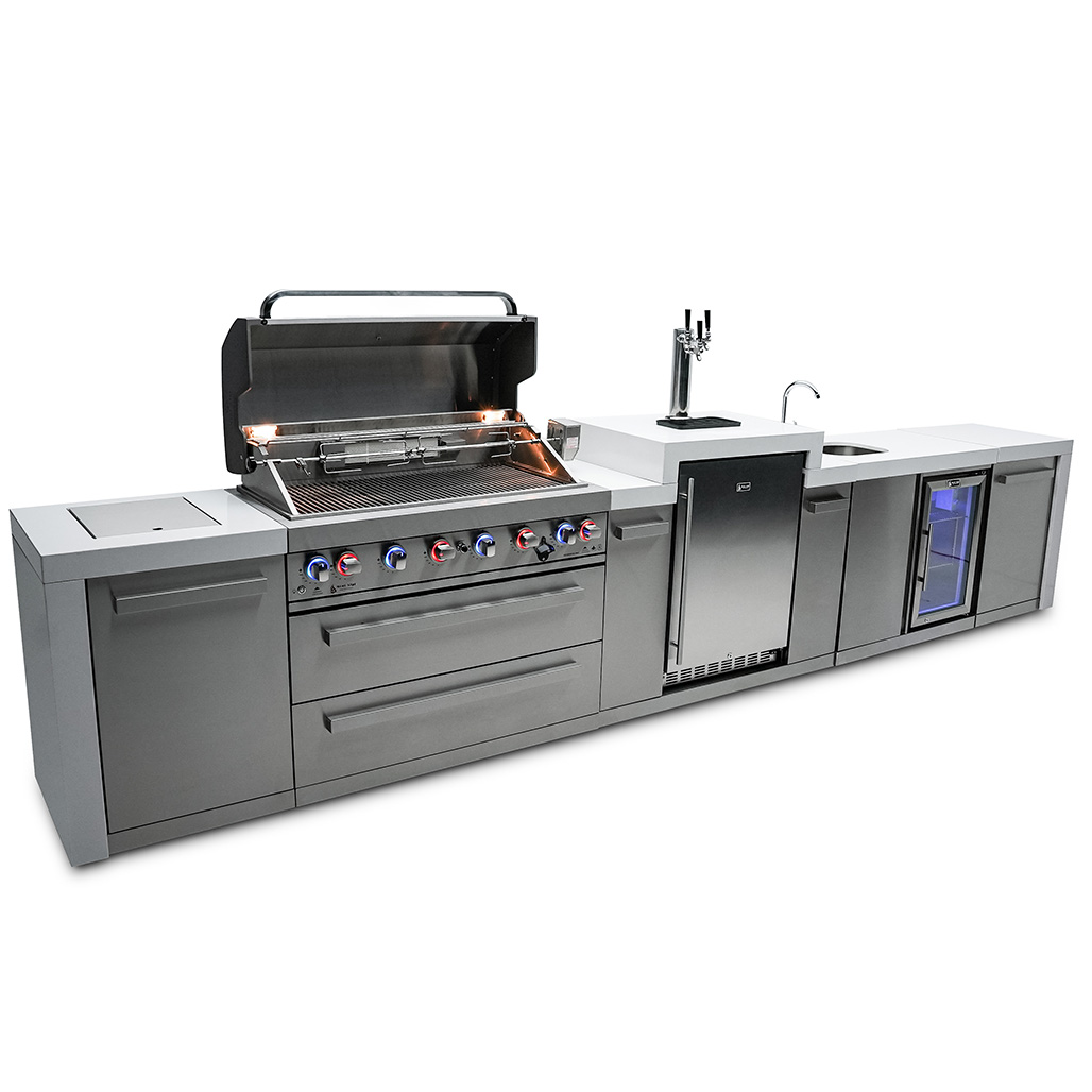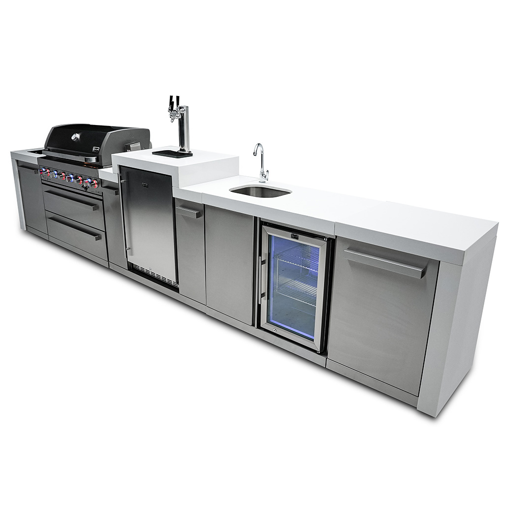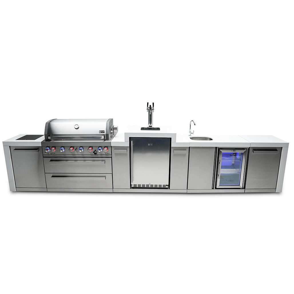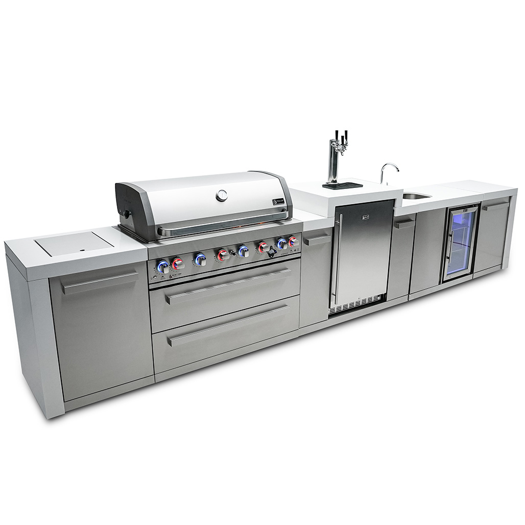 Upgrade your outdoor cooking game with the Mont Alpi 6-burner Deluxe Island with Kegerator and Beverage Center. The MAi805-DKEGBEV is the perfect solution for those who love to entertain outdoors. With six burners and an infrared side burner, you can cook anything from a simple burger to a complex rotisserie chicken. But that's not all - the 3-pour kegerator with a granite top and drip tray keeps your drinks cold and accessible for your guests, while the outdoor-rated fridge and sink in the beverage center offer the ultimate prep station.