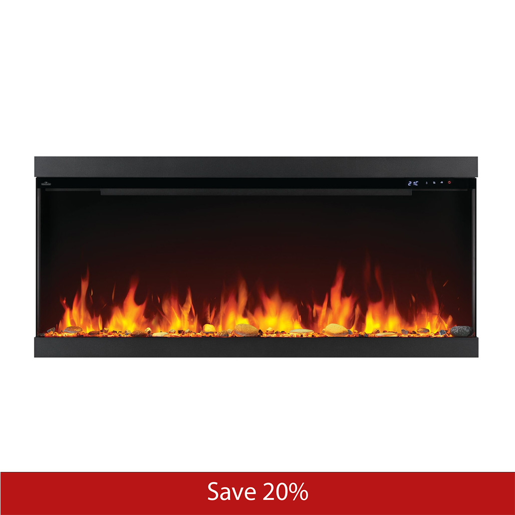 The Astound 50 FlexMount Electric Fireplace is the ideal addition to comfortable and connected living. Our unique spark technology further enhances the flames for intense realism, while the inclusion of Beach Fire logs and Woodland media customizes the unit to match your personal tastes. Use the touch panel, included remote, voice, and mobile device control with the Napoleon Home App for unmatched mastery over your fireplace experience. Eco mode consumes less energy, while Boost mode adds an extra hit of heat on those chilly days. Customize your heat and color settings for each day of the week by setting a schedule. Thirteen ember bed and top light colors allow you to set the mood, while optional and included glass and log sets ensure this Napoleon Fireplace matches your aesthetic. Not just a pretty fireplace, with its supremely flexible installation options and easy maintenance, the Astound can personalize any room or commercial space.