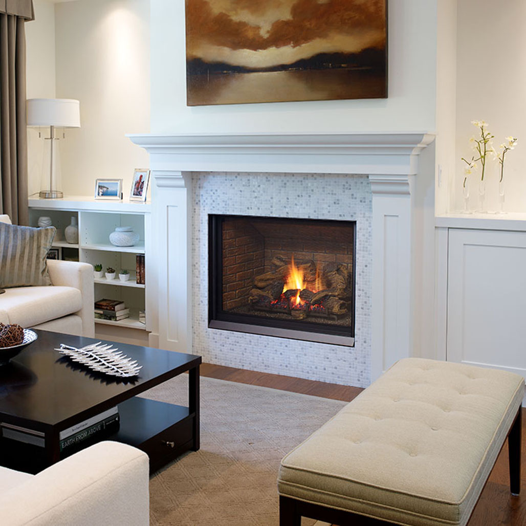 A direct vent fireplace has a completely sealed combustion chamber which allows it to vent directly out a side wall or through the ceiling of your home. The benefit of this system is that it brings in air from the outside of the home rather than using the room air.