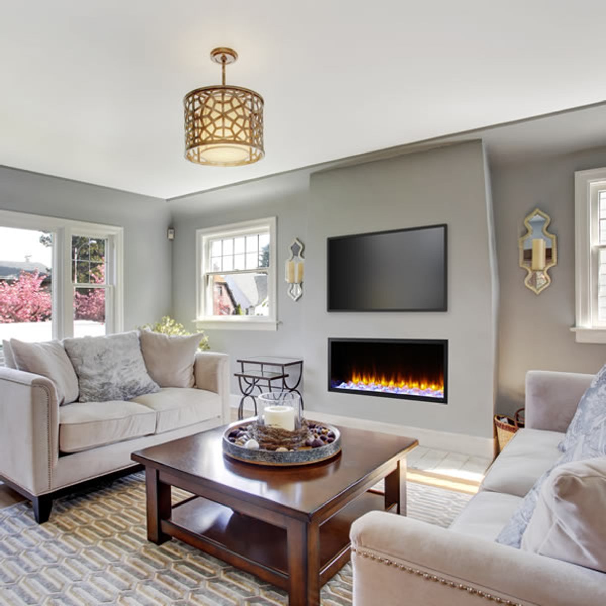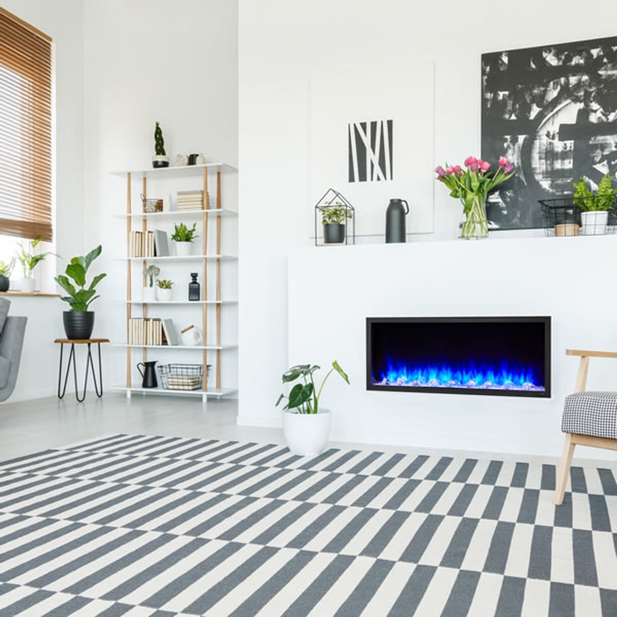 Create a stunning atmosphere from any angle with the SimpliFire Scion Trinity electric fireplace. This modern, linear unit is available in three unique configurations: bay, corner or single-sided. Complement its contemporary style with a floating mantel kit, wall-mount kit or enjoy a built-in, flush design installed by pros. Available in 43-inch and 55-inch fireplace widths.BUILT-IN FLUSH DESIGN