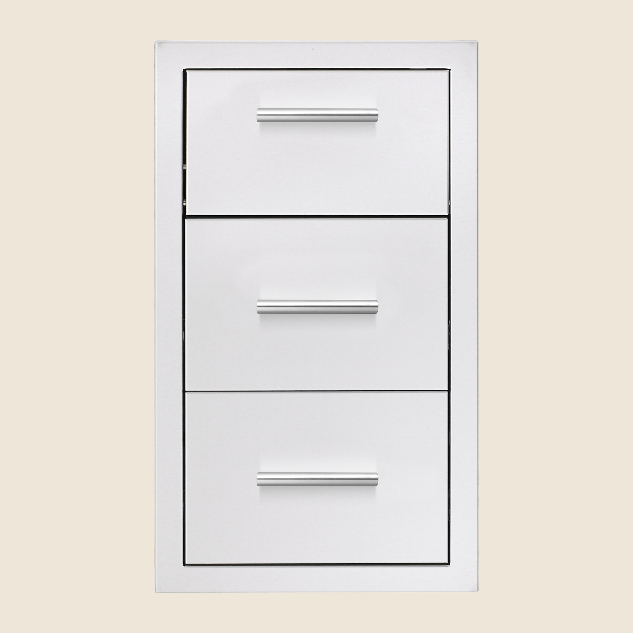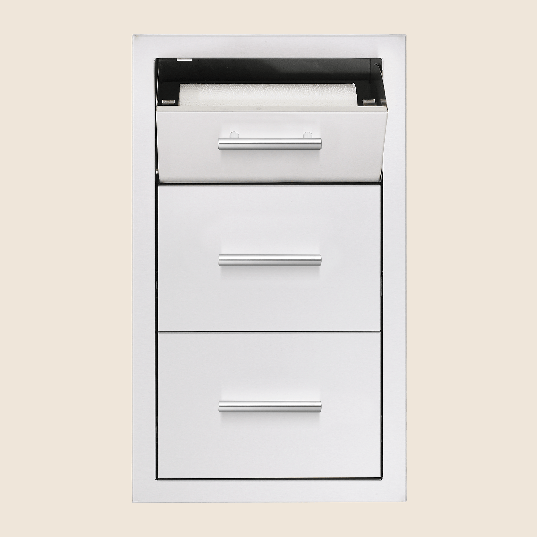 Maximize your outdoor kitchen with Summerset Drawers, designed for efficiency and durability. The 17″ x 30″ Vertical 2-Drawer & Paper Towel Combo features #304 Stainless Steel, a Hingeless Design, Soft-Close Tracks, Summerset Bar handles, and Weather-Sealed Construction—all backed by a Gold Standard Lifetime Warranty for lasting performance.