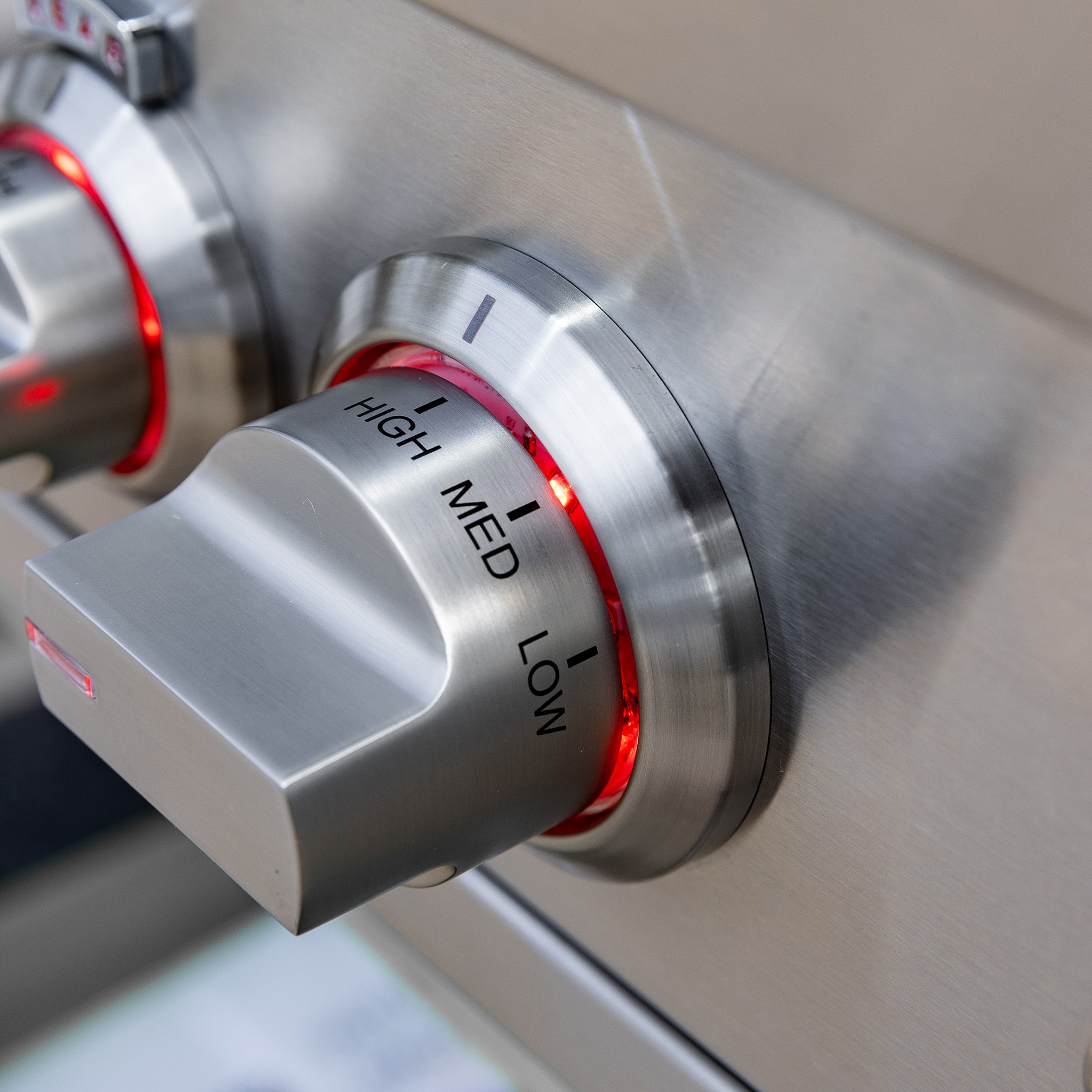 Exterior LED Lighting + White to Red Bezel Lighting Indicating ON/OFF Burner State, and Halogen interior Cooking Lights