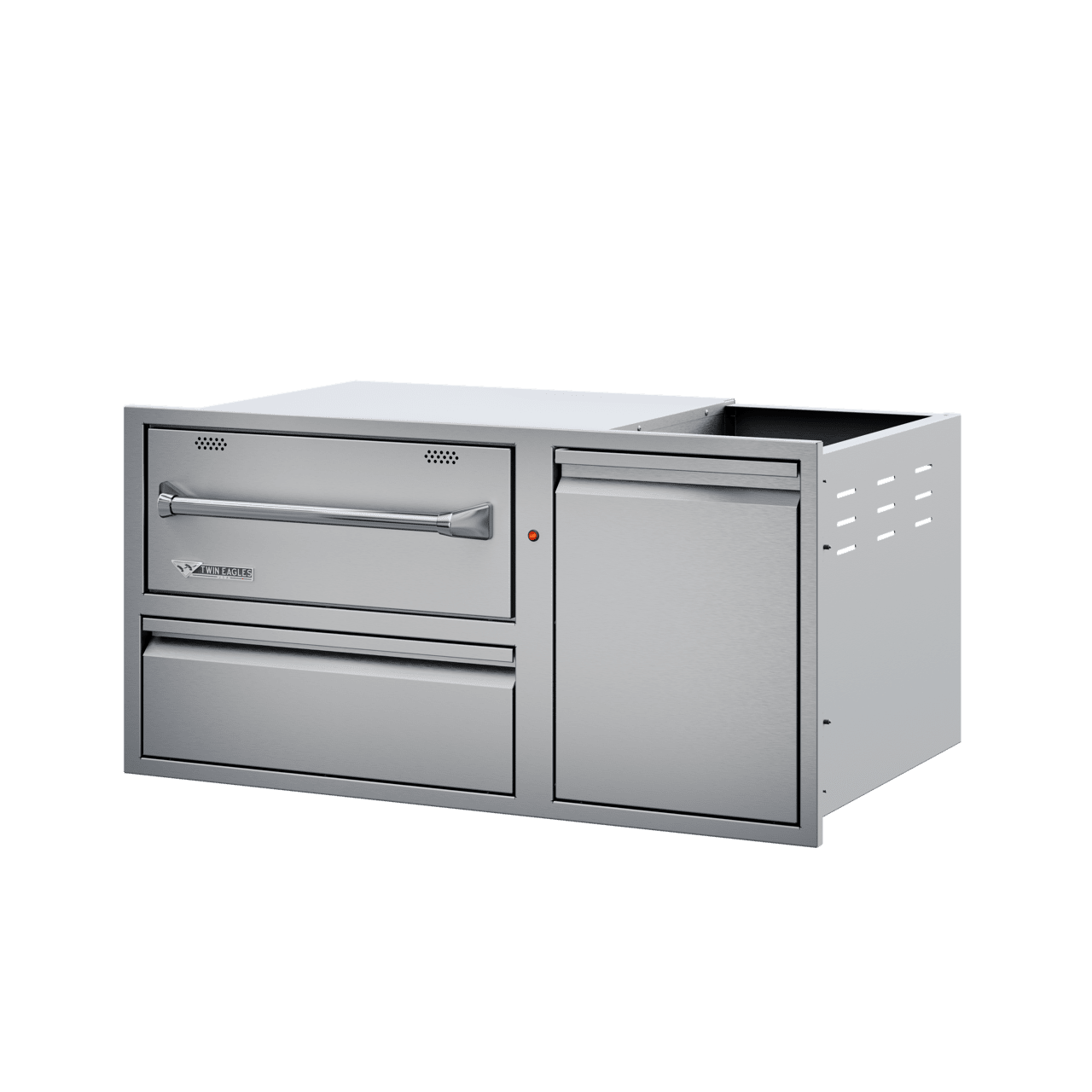 Temperature range of 60-220°F with concealed heating element. Highly versatile; warm, defrost, proof yeast. Humidity controls to keep your food dry and crisp or moist and tender. UL approved for outdoor or indoor use. Built in storage drawer and access door.