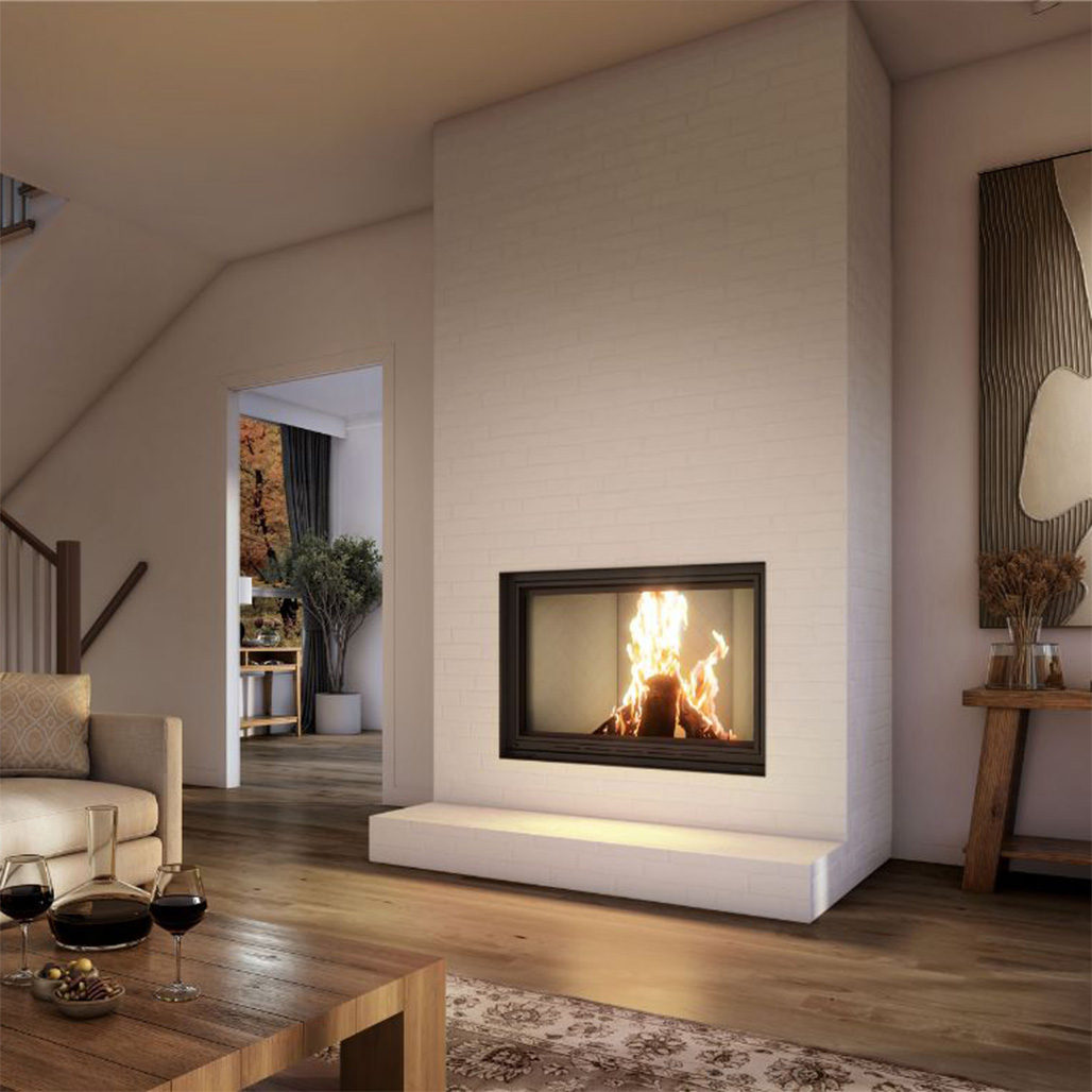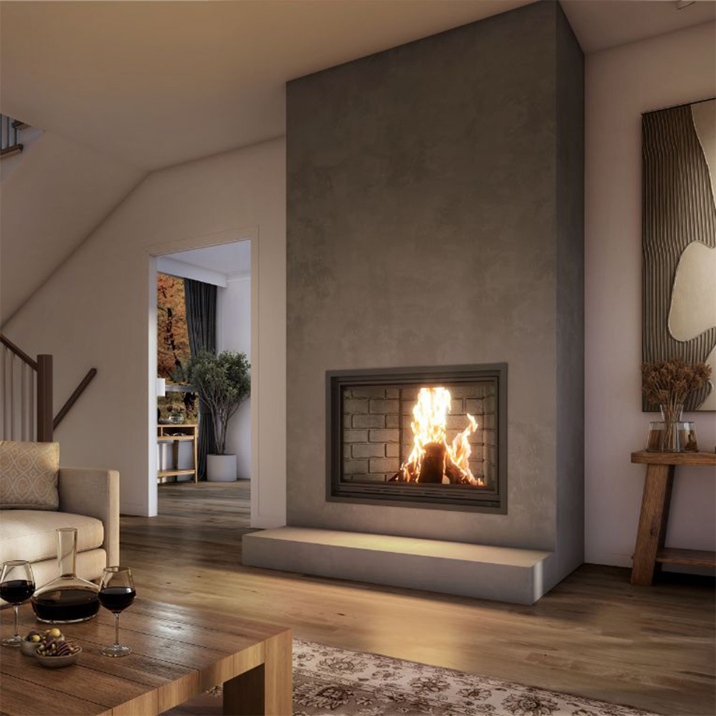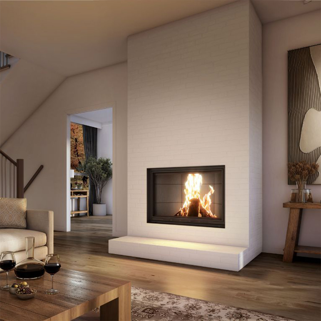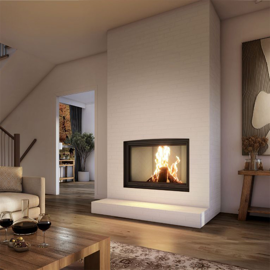The Frontenac wood fireplace combines elegance and modernity, creating a warm and refined ambiance. Its minimalist and sleek faceplate adds a sophisticated touch to any interior, enhancing the space with contemporary aesthetics. It stands out with its imposing size and large 972 in² glass surface, offering a captivating view of dancing flames.
