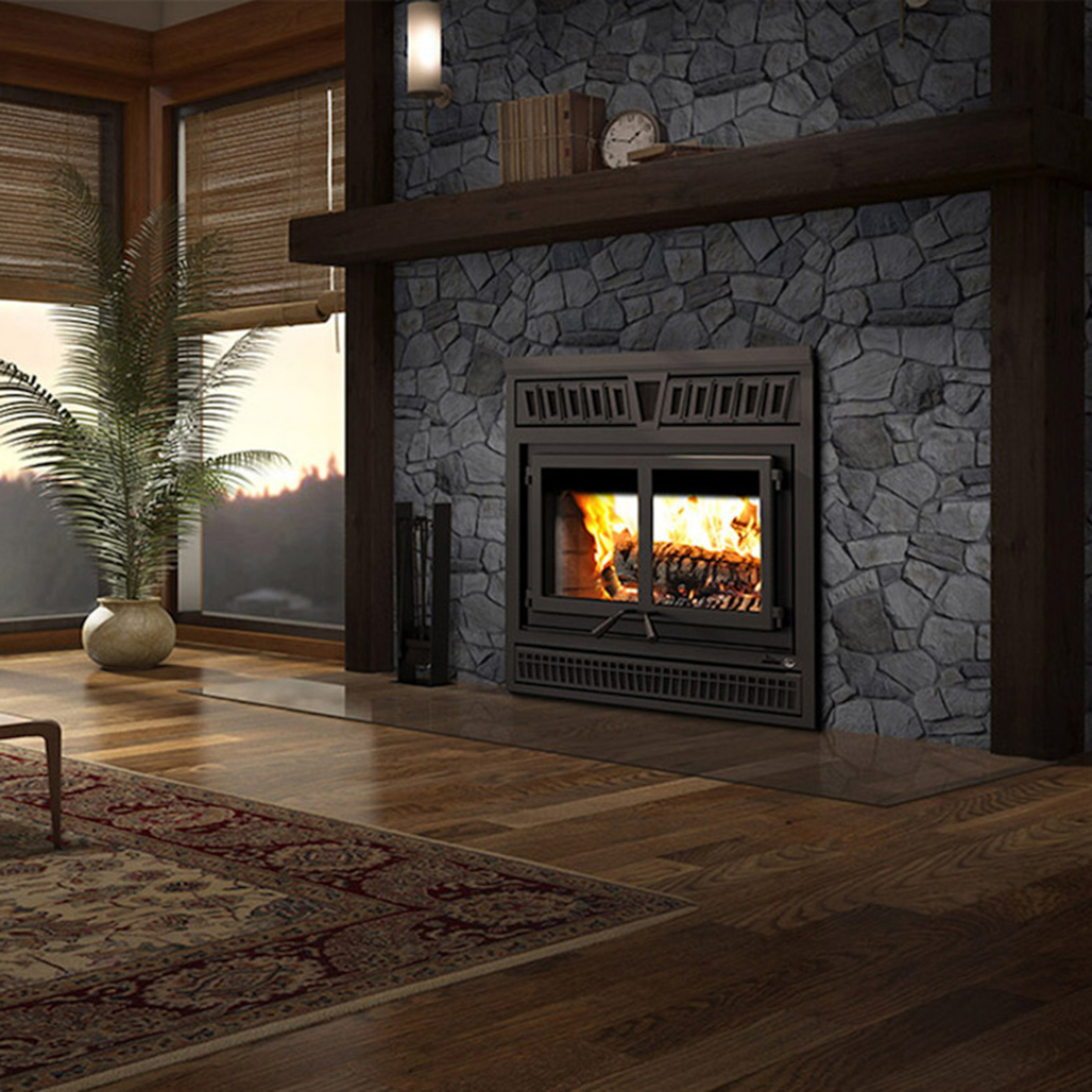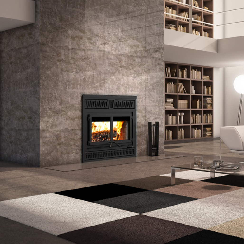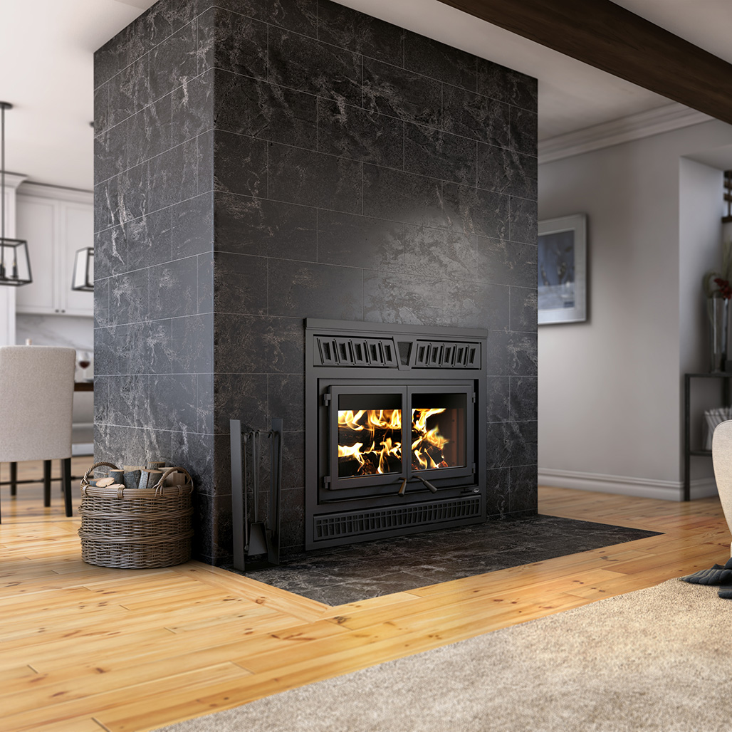 This striking wood fireplace is a logical and eco-friendly option for any homeowner looking to combine style and high efficiency. Its crowned facade will make it the king of your residence!
